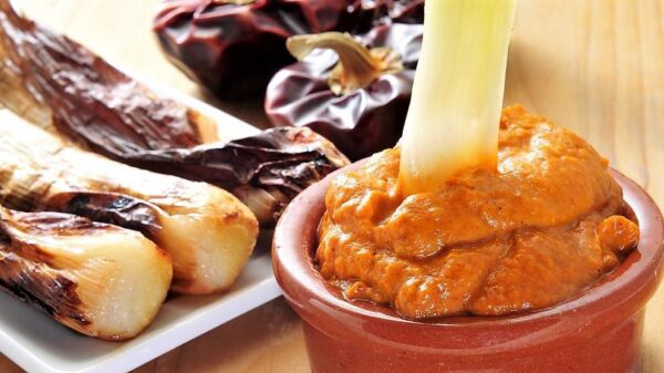 El calçot es una cebolleta tierna y con la salsa romescu es la base de la calçotada.