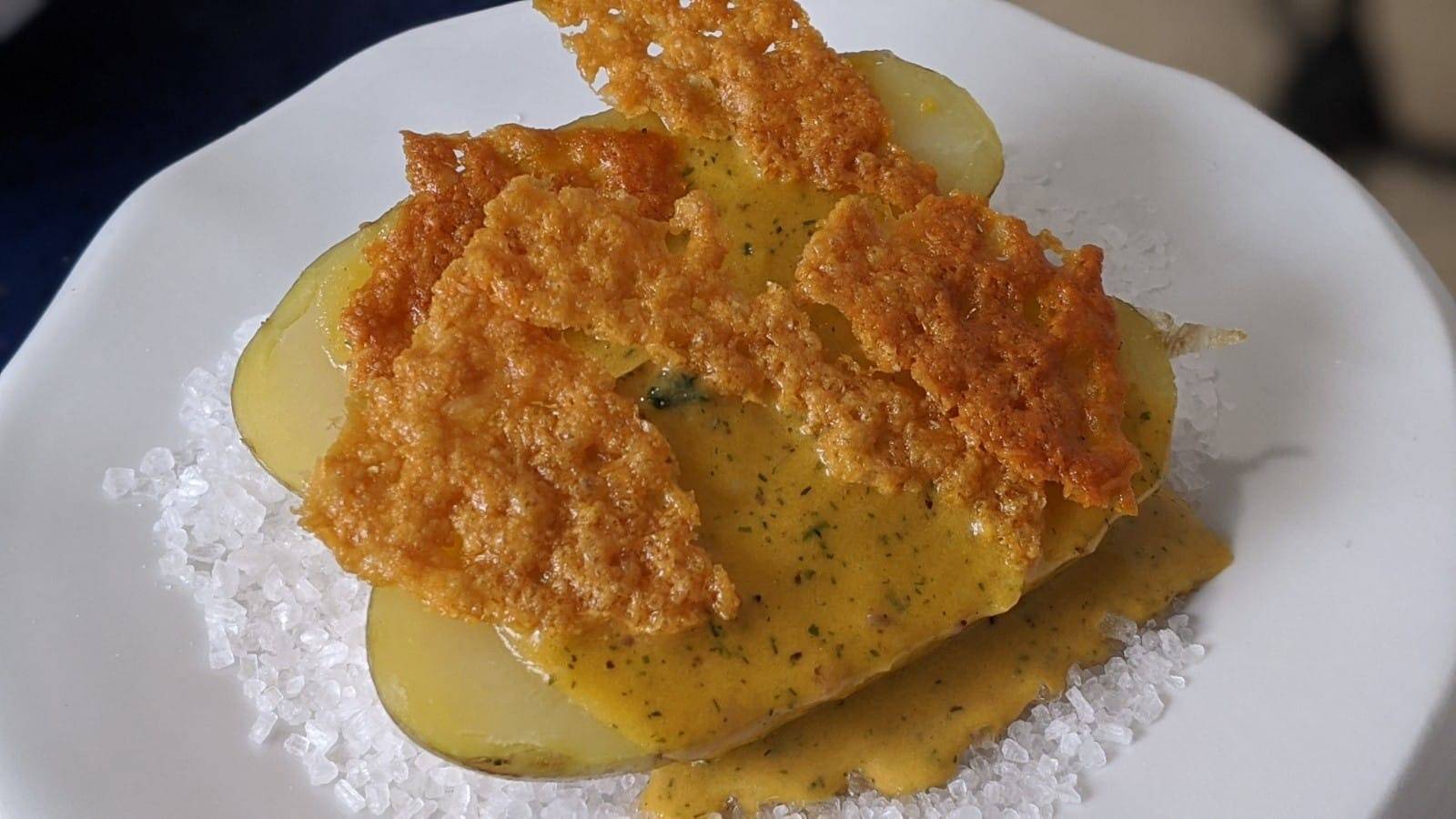 • Patata asada Cesar / Nuestra versión de patatas bravas en copa : uso de patatas « asadas, purée » cremoso.