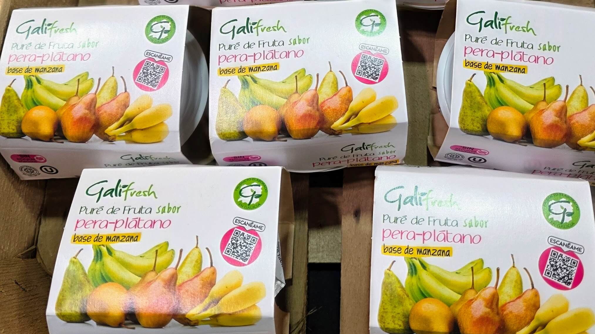 Purés de fruta GaliFresh. Son presentaciones de 100 gramos, con pulpa de plátanos y pera. La marca está en Galicia. Sus presentaciones recuerdan a los yogures y tienen opciones; manzana y pera, manzana y kiwi, manzana y mango, fresa y arándano (..)