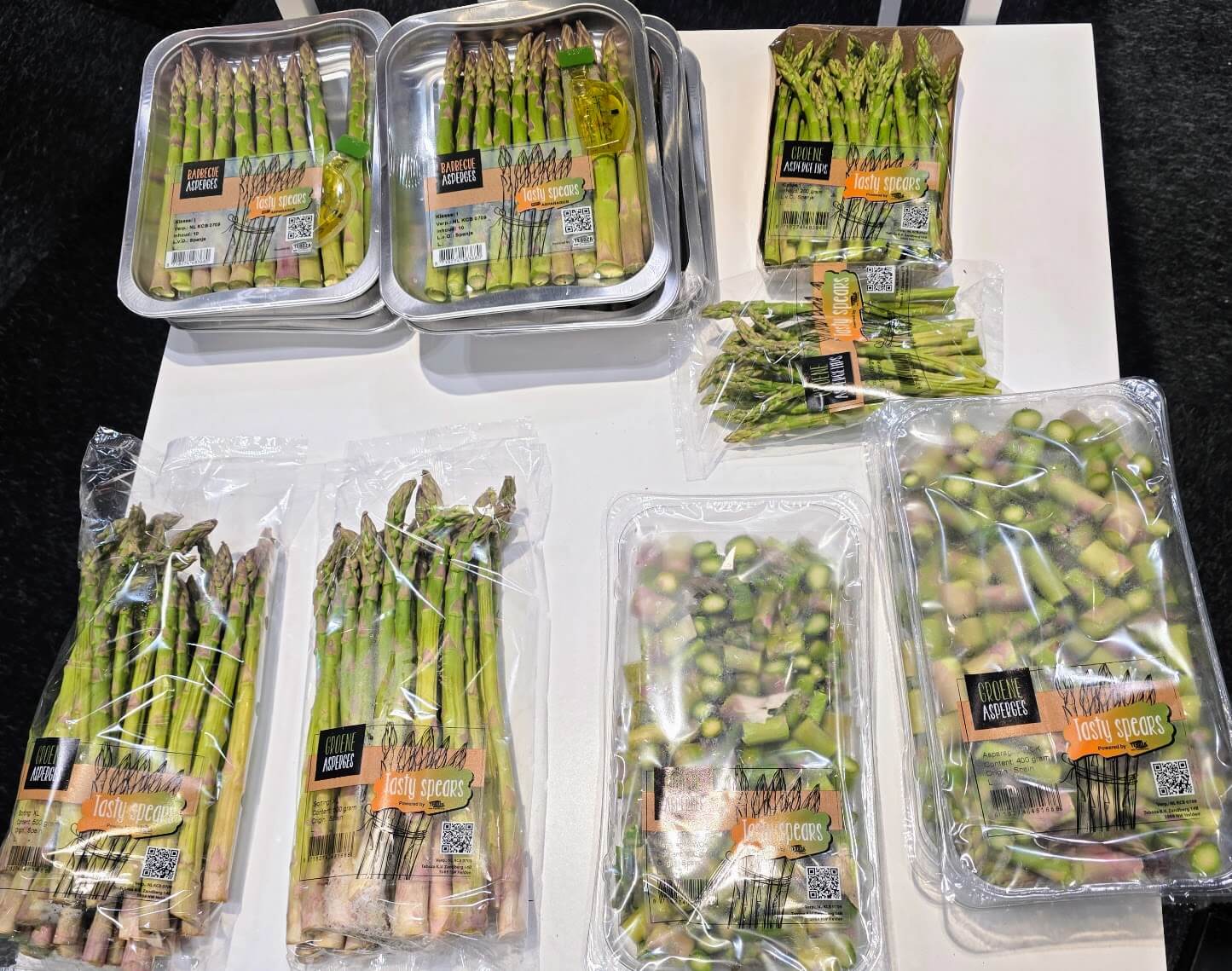 Espárragos. Valores en esta marca. Las presentaciones son flowpack, con varios tamaños, envase de trozos limpios y listos para cocinar, cartoncillo y en bandeja para hornear y bolsa para microondas.