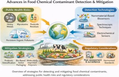 La imagen, de Isra, M. et al, 2026, ilustra estrategias para detectar y mitigar el efecto de contaminantes alimentarios